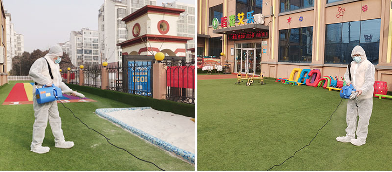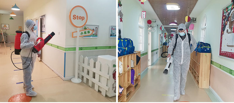 為了此次活動,海拓集團特別提供了一臺背包式靜電噴霧器、一臺風送多功能靜電噴霧器、兩臺超低容量手持冷霧機,并且嚴格按照藥劑配比和消毒流程進行消毒工作。工作人員身穿防護服,手持彌霧機,對校園內廣場、游戲設施、道路、樓梯、走廊、教室、衛(wèi)生間、宿舍等場所進行全面消毒,不留死角,不留盲區(qū),為孩子們創(chuàng)造安全、衛(wèi)生、整潔、明亮的校園環(huán)境。