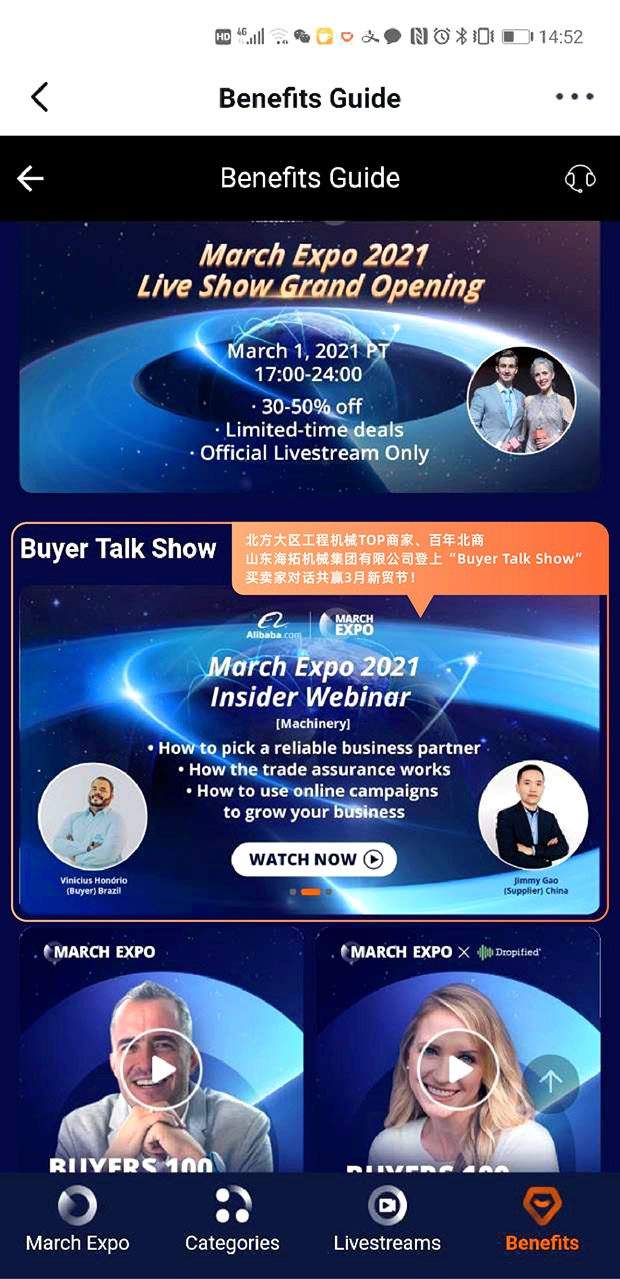 新貿(mào)節(jié)會場買家Befefits頁面直接進(jìn)入,半小時(shí)對話節(jié)目海拓機(jī)械代表北方商家強(qiáng)勢發(fā)聲!