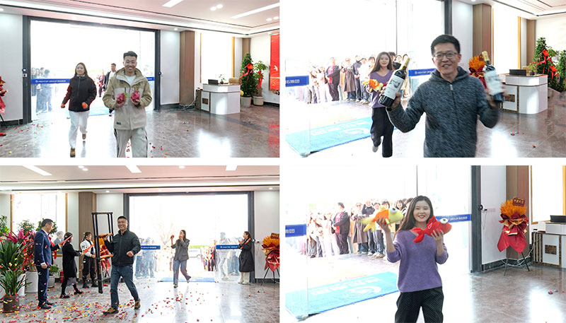 在眾人的期待中,員工代表們手捧寓意美好的物品,邁著整齊的步伐走進(jìn)新辦公大樓。手持現(xiàn)金的員工,寄托著海拓集團(tuán)財源滾滾的美好愿景;扛著梯子的員工,祝福公司步步高升;拿著柿子茶罐和兩瓶酒,寓意事事如意、長長久久;捧著蘋果的員工,祈愿公司平安順?biāo)欤荒弥瘕埞膯T工,象征著事業(yè)紅紅火火;玩具魚和花餑餑,則寓意著年年有余、生活富足。員工們臉上洋溢著自信幸福的笑容,對海拓的未來充滿期待,也為典禮增添了一抹溫馨而熱烈的色彩。