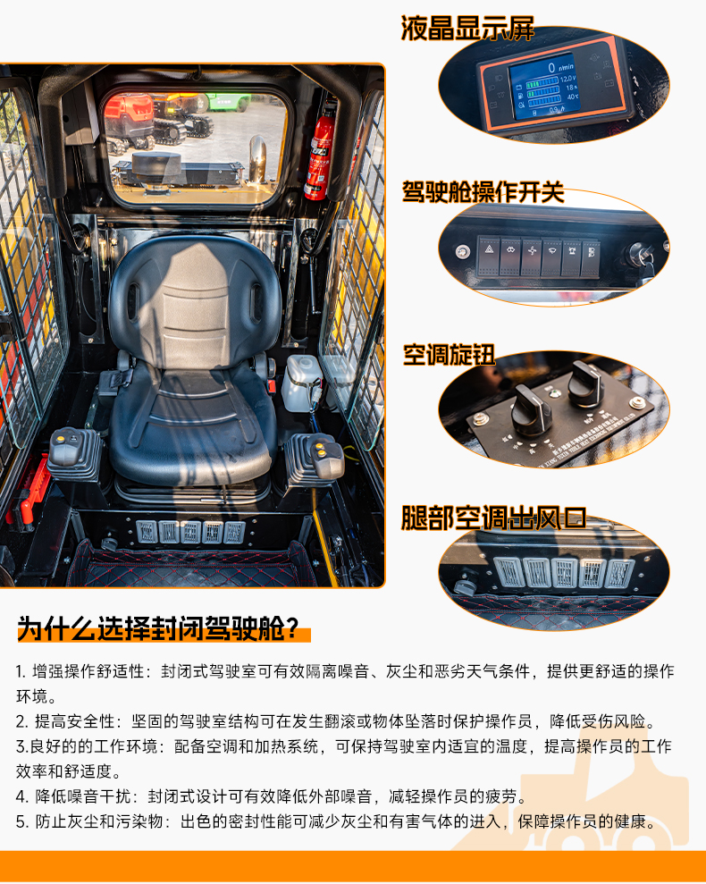 HTS50滑移裝載機配備快換裝置、安全自鎖裝置、大臂支撐裝置、降噪海綿、前液壓輔助裝置、倒車警報及喇叭等多重功能配置。