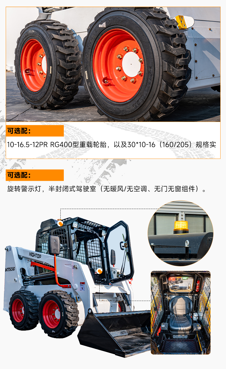 4,可選配10-16.5-12PR RG400型重載輪胎,以及30*10-16(160/205)規(guī)格實芯輪胎;旋轉警示燈,半封閉式駕駛室(無暖風/無空調(diào)、無門無窗組件)